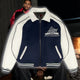 Wool jacket with leather sleeves. Features Avirex textured croc crest applique at front.