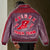 Avirex leather jacket with track team art patch set in patent and chenille. Features color blocking at sleeves and pockets.
