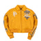 - Traditional flight jacket applied multi layered leather patches with direct embroidery and multi colored rhinestones applied throughout on the front body, back body and sleeves of the jacket
